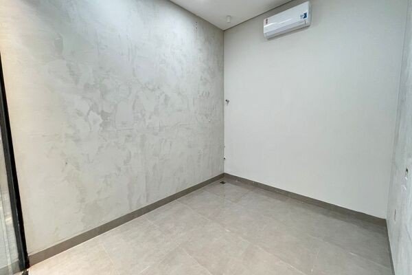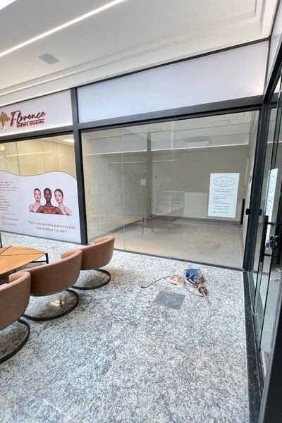Cômodo em piso porcelanato, teto de gesso com iluminação, ar-condicionado, vitrine em blindex.