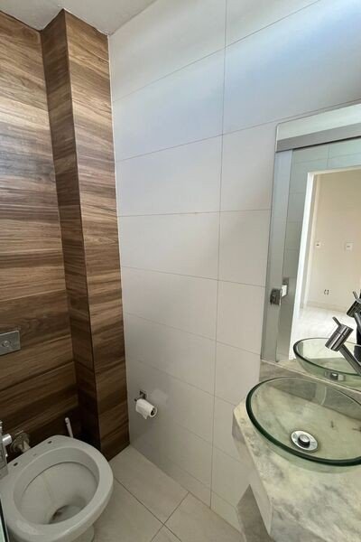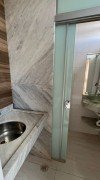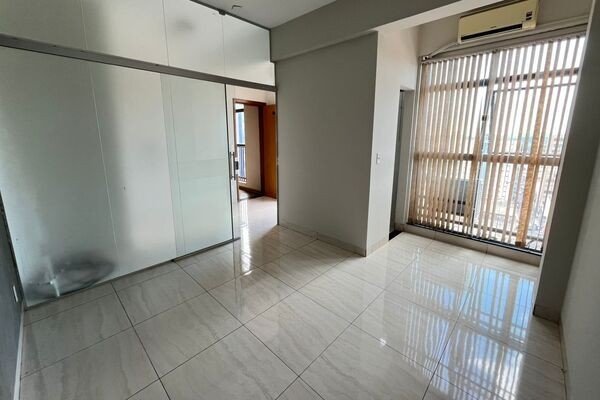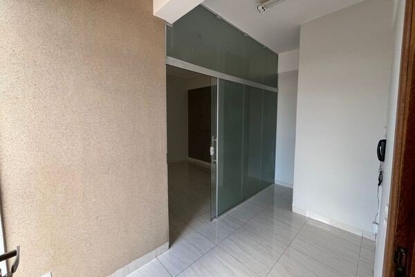Recepção, sala com ar-condicionado, banheiro, piso porcelanato.