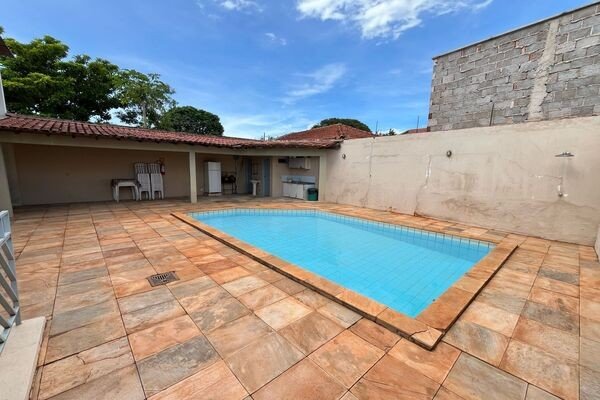 Sala ampla, 2 quartos sendo 1 suíte com closet e outro com armário, banheiro social, cozinha com armário, área de serviço, escritório, piso de cerâmica e tábua corrida, laje, área de lazer, garagem para 1 carro.