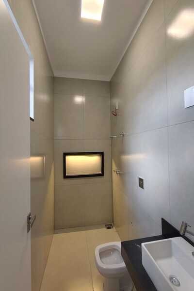 Casa nova, recém construída, com garagem para 2 carro e entrada para mais 2, jardim, área gourmet com churrasqueira e armários, sala com pé direito duplo e jardim de inverno, cozinha com armário e com jardim de inverno, área de serviço, despejo, 3 quartos sendo todos suítes e um dele com closet, todos os quartos com jardim de inverno, banheiro social, piso de porcelanto e laje, sendo 8mx30m.