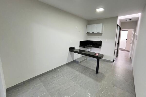 Sala conjugada com cozinha e ar-condicionado, quarto com jardim de inverno e ar-condicionado, banheiro social, área de serviço, garagem para 1 carro, portão eletrônico, interfone, piso porcelanato e laje.