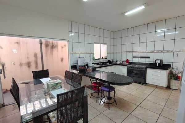 Garagem para 2 carros, jardim, sala, banheiro social, 3 quartos sendo 1 suíte com armário embutido, copa conjugada com cozinha, armários abaixo da pia, área de serviço fechada, despensa, área nos fundos, área para churrasco com pia, quintal cimentado, laje, cerâmica, portão eletrônico, interfone, lote 12mx30m.