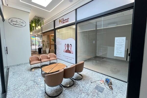 Cômodo em piso porcelanato, teto de gesso com iluminação, ar-condicionado, vitrine em blindex.
