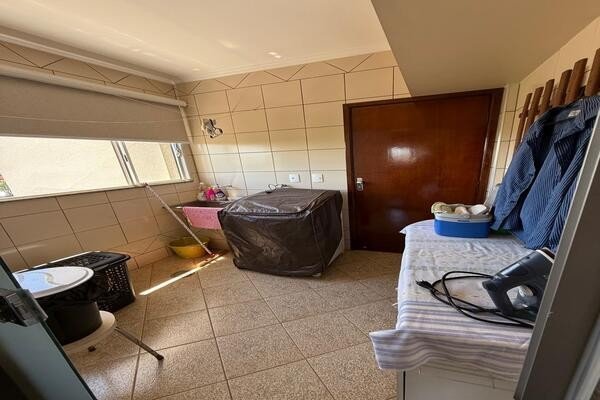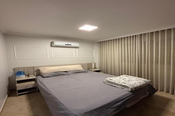 3 quartos sendo uma suíte com armários, todos quartos com ar-condicionado, sala conjugada com cozinha e ar-condicionado, armários e painel de TV, banheiro social, área de serviço com armários, garagem para 1 carro, piso cerâmica, apartamento com acabamento de gesso na laje, cortinas e cortinas blackout, piso cerâmica
