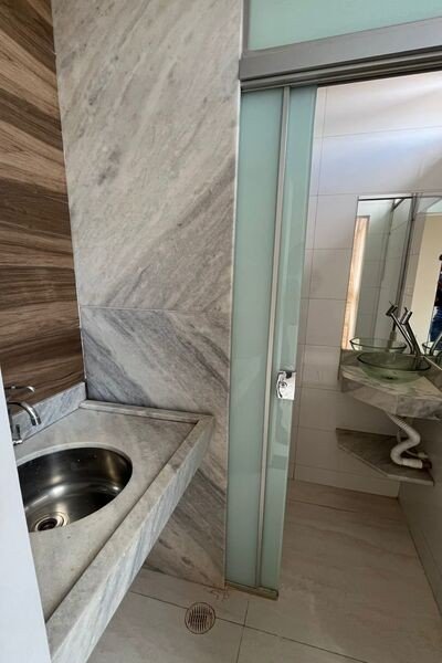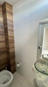 Recepção, sala com ar-condicionado, banheiro, piso porcelanato.