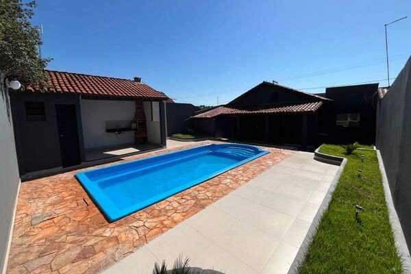 Casa toda reformada, com garagem para 2 carros e entrada para 2 carros, sala, copa conjugada com cozinha, 3 quartos sendo 2 com armários, banheiro social, área de serviço, varanda no fundo, piscina, área de lazer com churrasqueira, banheiro no fundo, despejo, quintal revestido com porcelanato e pedras, laje e porcelanato, motor eletrônico, interfone.