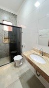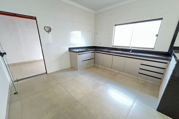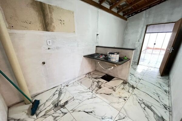 Sala conjugada com cozinha (com armario abaixo da pia e balcão), 2 quartos, banheiro social, área de serviço, varanda no fundo, entrada para 4 carros, laje e porcelanato, portão eletrônico e interfone.