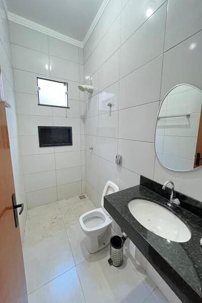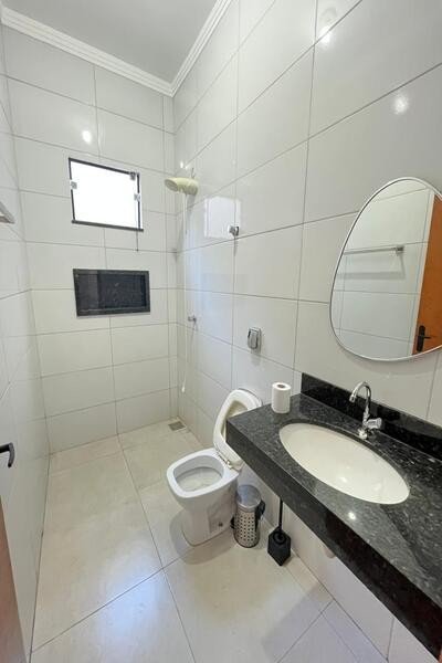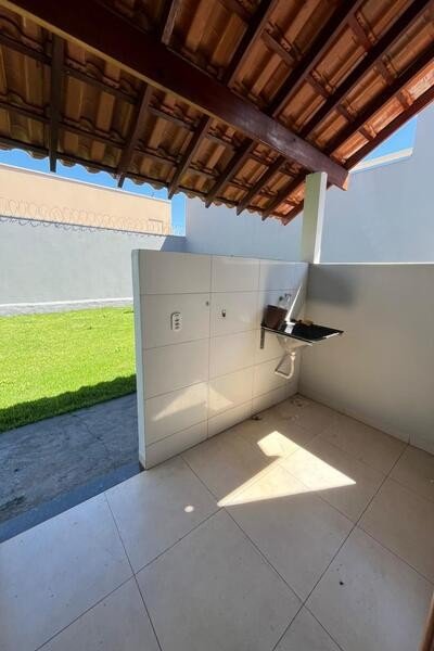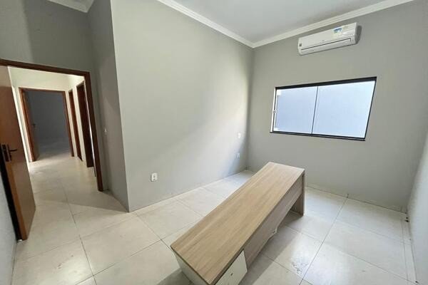 Sala conjugada com cozinha, com armários e forno, 3 quartos sendo 1 suíte e jardim de inverno e ar-condicionado, área de serviço, quintal gramado, garagem para 3 carros, laje e cerâmica.