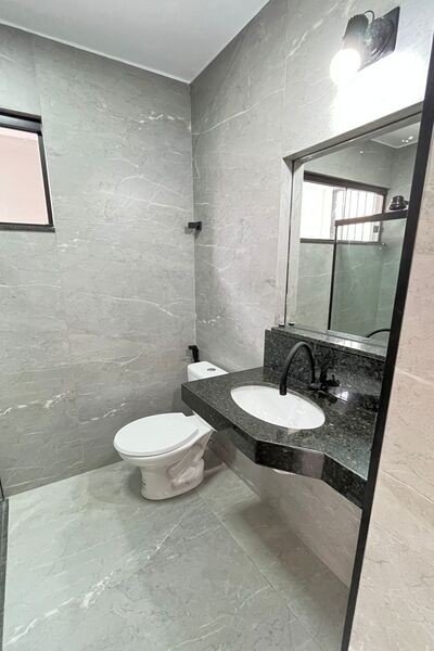 garagem para 1 carro, área de serviço, portão eletrônico, interfone, piso porcelanato e laje.