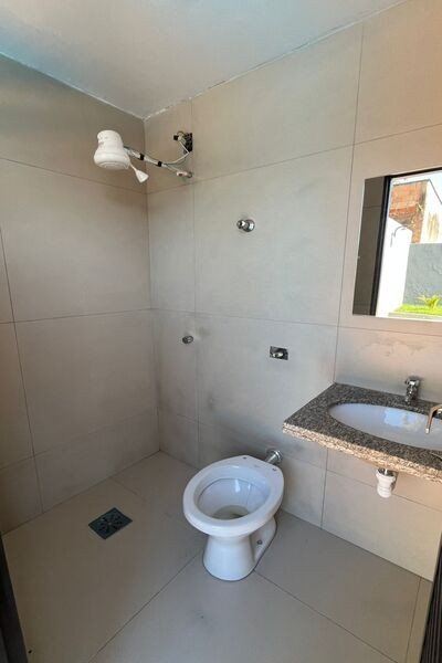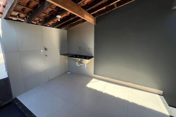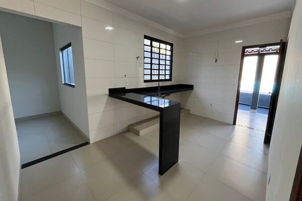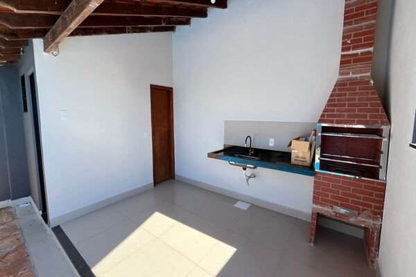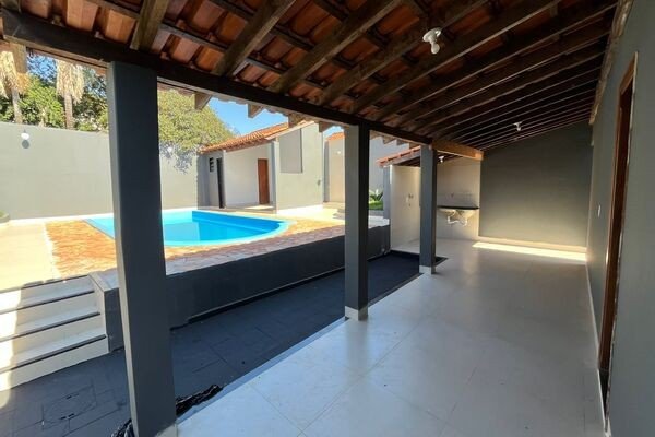 Sala, copa conjugada com cozinha, 3 quartos sendo 2 com armários, banheiro social, área de serviço, varanda no fundo, piscina, área de lazer com churrasqueira, banheiro de serviço, despejo, quintal, garagem para 2 carros, piso porcelanato, portão eletrônico e laje.