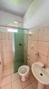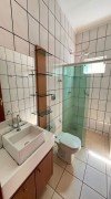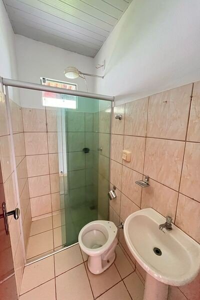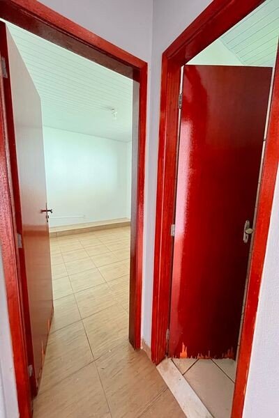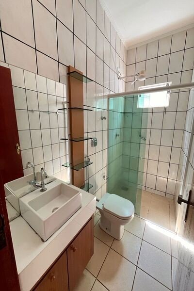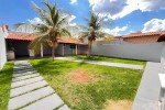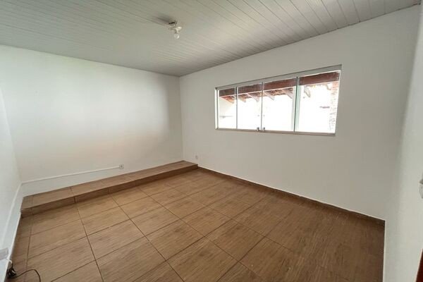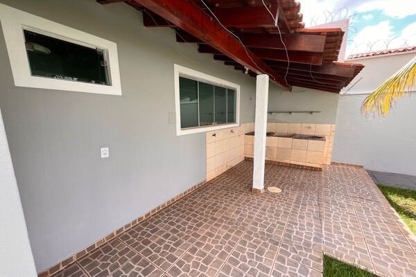 Sala, 3 quartos sendo um com closet, banheiro social, cozinha, área de lazer com churrasqueira, cômodo no fundo com banheiro, quintal, garagem para 2 carros, laje e cerâmica, portão eletrônico, interfone e cerca elétrica.